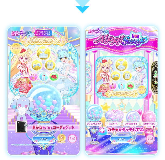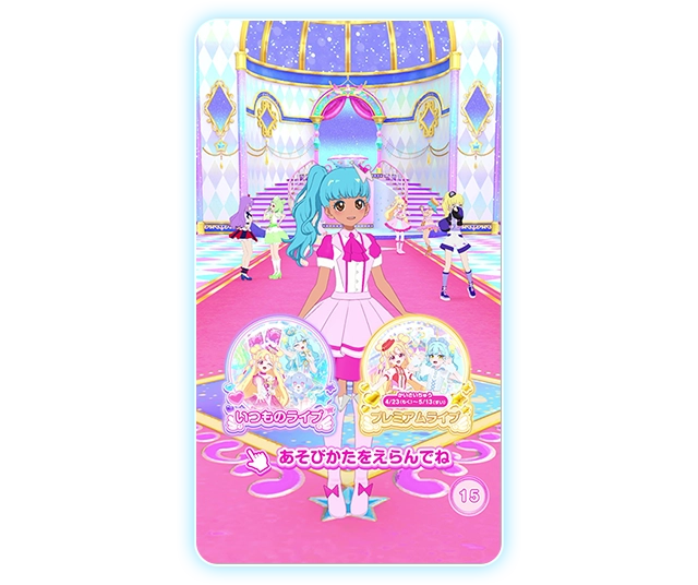 プレミアムライブで遊ぶには、「アイプリバース おねがい1だん」以降で1回遊んだセーブコードが必要です。